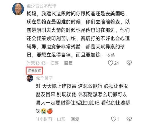 看着杨妈感动万分的样子,众多球迷也是打开了话匣子,纷纷为杨瀚森着急,纷纷为杨瀚森着想,也纷纷给杨妈提出建议。没错,球迷不约而同的说到在美国陪杨瀚森的女朋友,他们建议马上叫杨瀚森让女朋友离开美国,别在干扰杨瀚森的训练和比赛,不要把时间花在花前月下。球迷众口一词地劝说:“杨妈,我建议这段时间你跟杨爸还是去美国吧,现在是瀚森最困难的时候,你们去陪陪瀚森,以前姚明去火箭的时候也是他爸妈在那边,他们还会鞭策姚明刻苦训练,赛后打的不好也会心理辅导。那边竞争非常残酷,都是天赋异禀的球员。要想立足得自律,而且在加练。”而杨妈也是点赞了这条评论。在杨妈的抖音几乎全是劝杨妈让瀚森女朋友回国,离开杨瀚森,好好让他训练,不要把时间过多地花在球场外。
