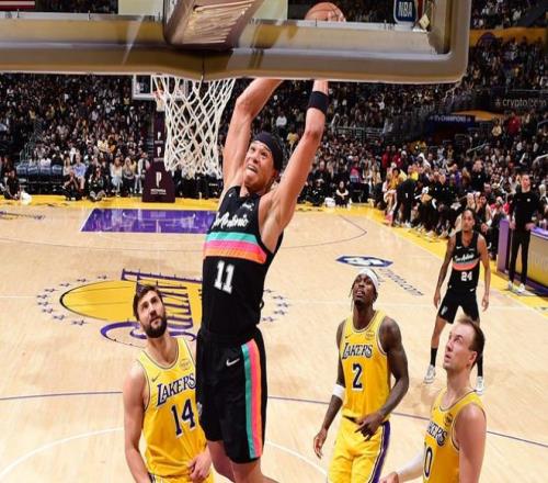 末节,克内克特抛投得分,奥利尼克上篮得分。蒂米三分命中,蒂耶罗扣篮2+1,蒂米又连得4分,把分差缩小到21分。约翰逊扣篮,麦克劳克林三分命中,奥利尼克上篮得分,麦克劳克林抢断得分,马刺回敬一波9-0。布朗尼三分命中,卡特-布莱恩特中投得分。布朗尼抛投命中,哈珀上篮得分。最终,马刺轻松击败湖人,拿下5连胜。