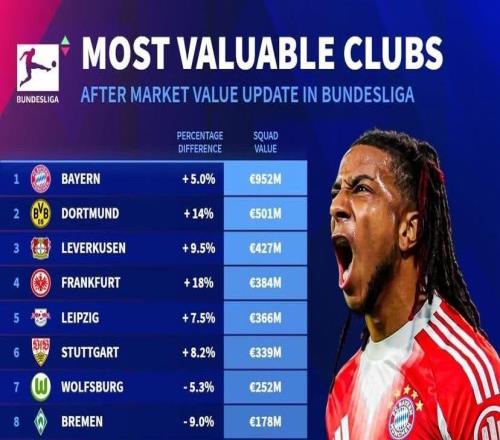 德甲俱乐部身价排名:拜仁超9.5亿高居第1,多特、药厂二三位